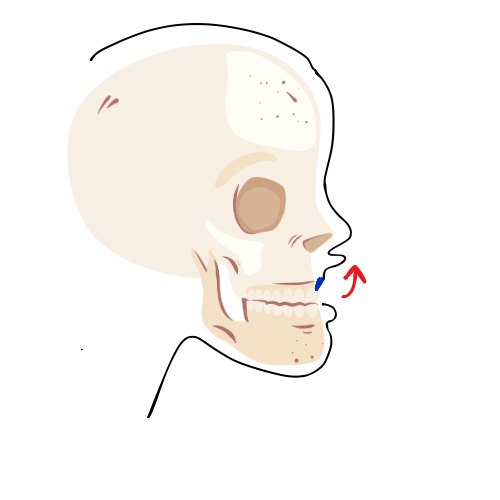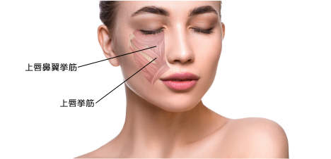 上唇を上に挙げる「上唇挙筋」と「上唇鼻翼挙筋」の2つの筋肉があります。これらの筋肉の緊張が過度に強いと上唇が上がりすぎて、笑った時に歯茎が大きく露出してしまいます。筋肉が原因の場合はボトックス注射による治療が効果的です。