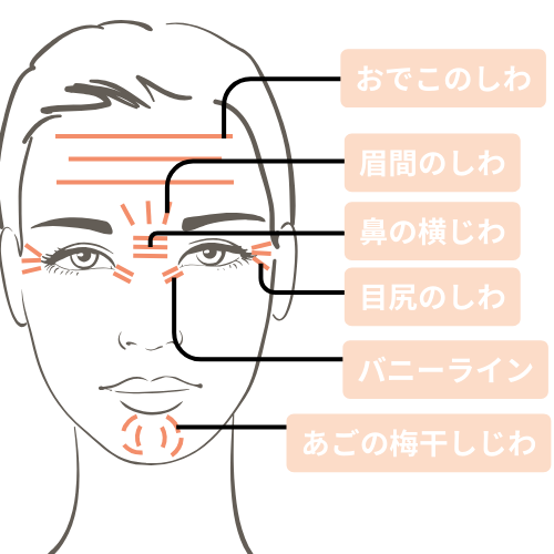しわに対してのボトックス注射は、しわの動きを止める作用があり、お顔にしわが寄らなくなる施術です。一般的に表情じわと呼ばれる、表情を作る時に出来るしわを作らなくします。