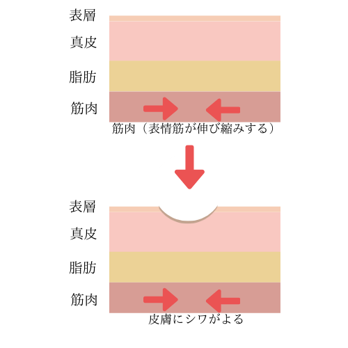 顔の表情を作る時に動く筋肉(表情筋)が伸び縮みすることにより、皮膚にしわが寄ります。