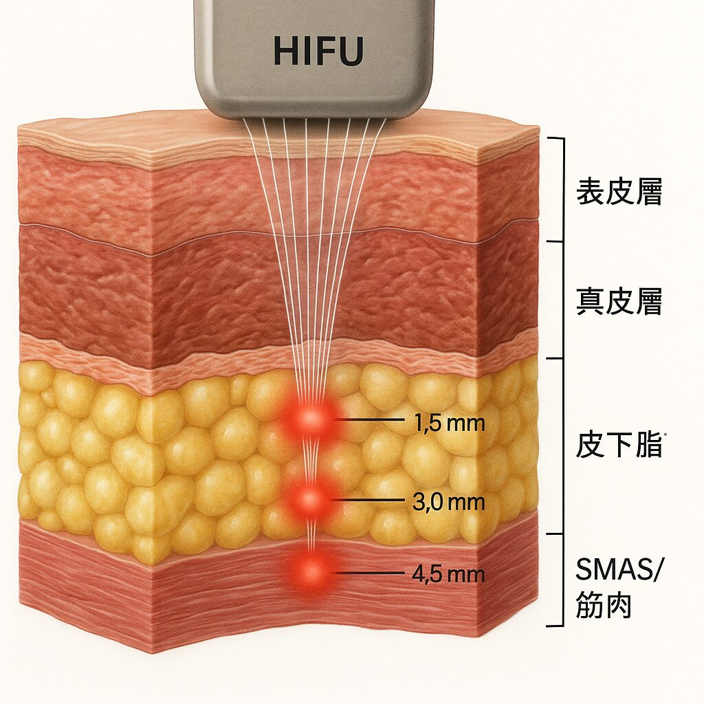 超音波のエネルギーを一点に集中させ、皮膚の深い層(特にSMAS層と呼ばれる筋膜)に熱を与えることで、肌を土台から引き締め、リフトアップ効果をもたらします。