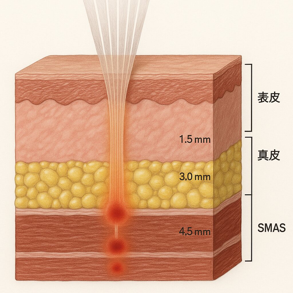 | HIFU | SAMS筋膜層・ 真皮深層 | 約3.0~4.5mm | 深部からのリフトアップ・フェイスラインのたるみ改善・引き上げ |