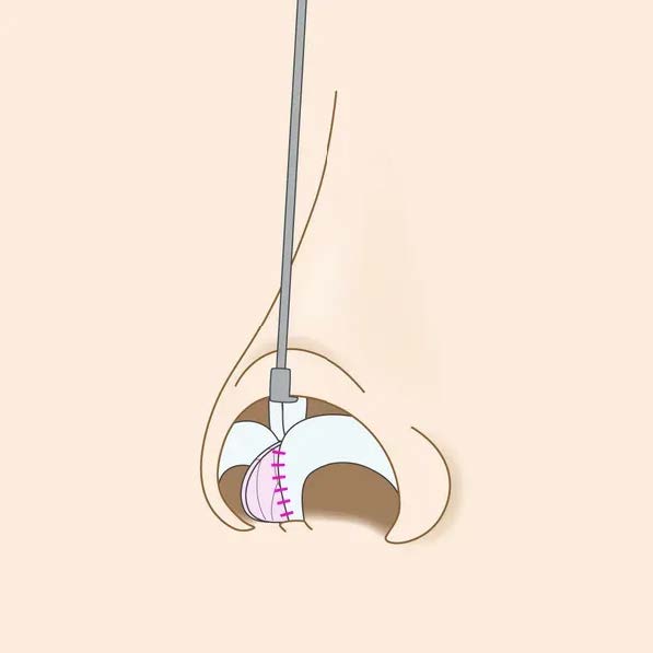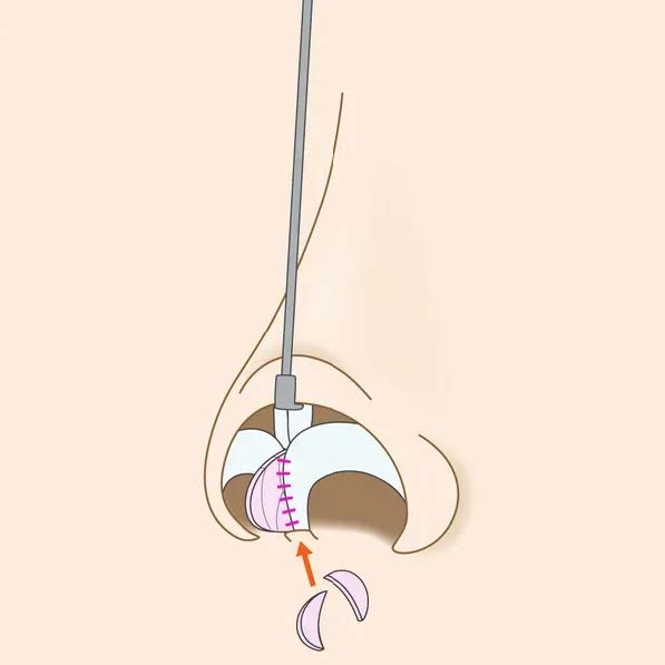 必要に応じて、鼻先の高さや厚みを出すために、追加の耳介軟骨または人工軟骨を鼻尖に移植します。