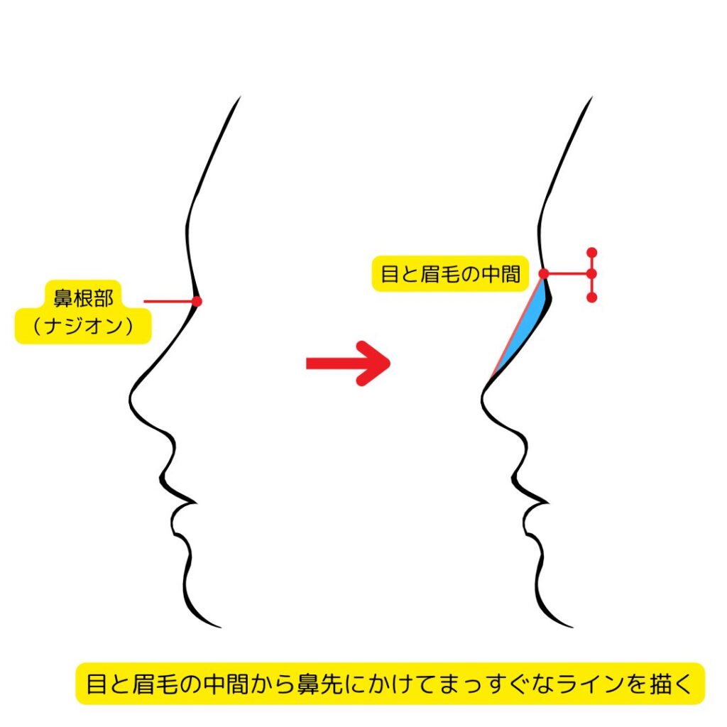 一般的に鼻筋の通ったお顔というのは、横から見て、目と眉の間から鼻先までが真っ直ぐなお鼻です。ここに足りない