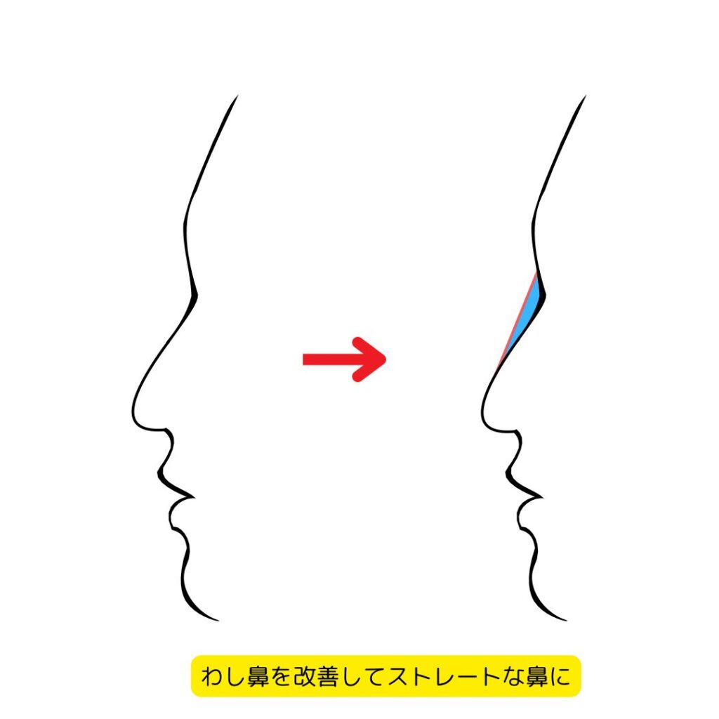 わし鼻というのはお鼻の中央部分(鼻背の骨)が盛り上がって見える事をいいます。この盛り上がりよりも上方にヒア