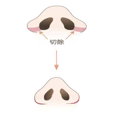 小鼻を一部切除しボリュームを減らすことで,鼻の穴の見える面積を小さくしスッキリした印象になります。