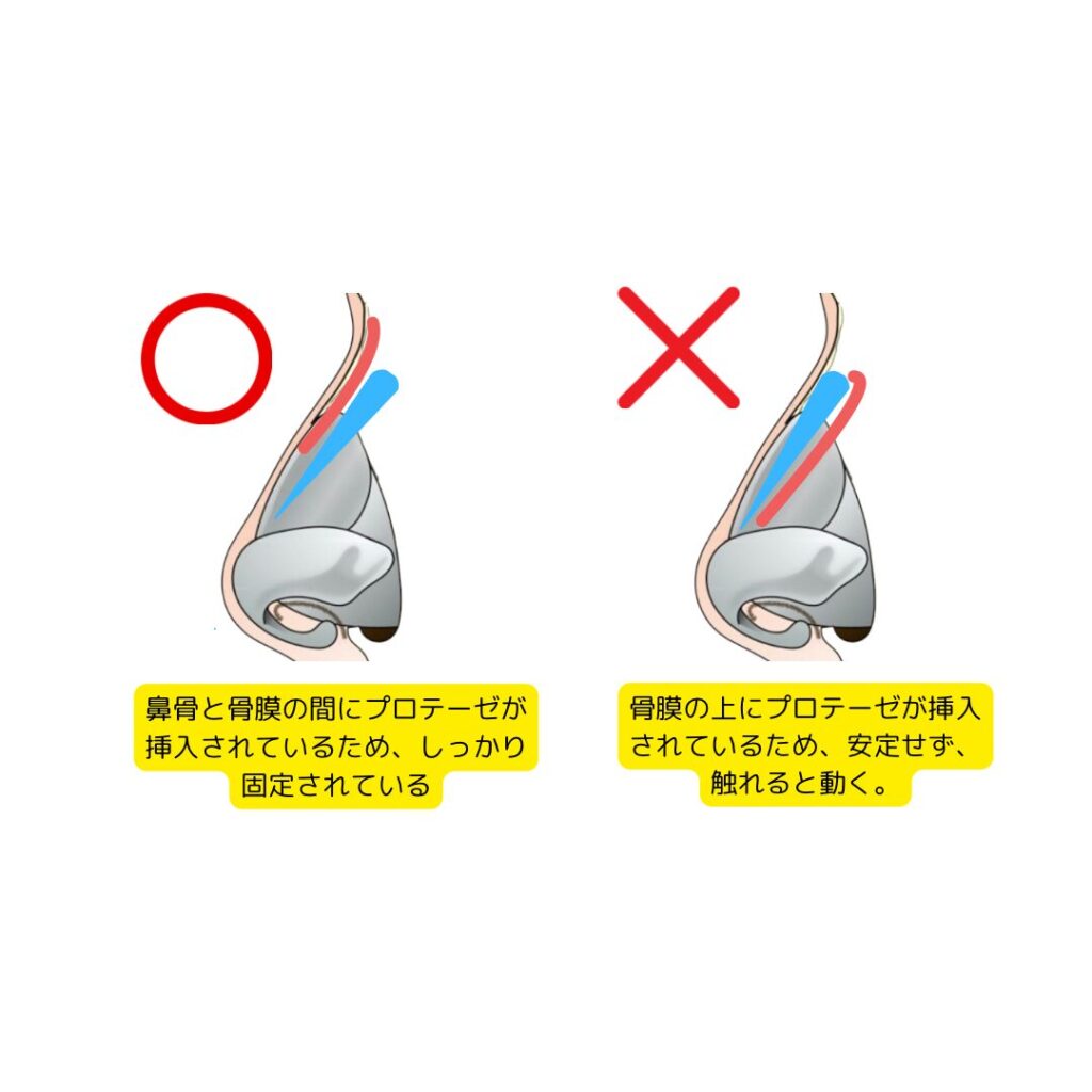 プロテーゼは、鼻骨の表面(骨膜上)ではなく、骨膜の下層(骨膜下)に正確に挿入することが非常に重要です。骨膜上に挿入されると、術後にプロテーゼが動きやすくなり、触るとグラつきを感じる原因となります。