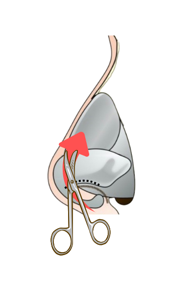 両側の鼻孔内を切開し、鼻中隔軟骨と外側鼻軟骨の間にアプローチします。
